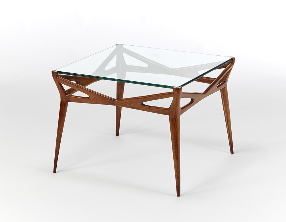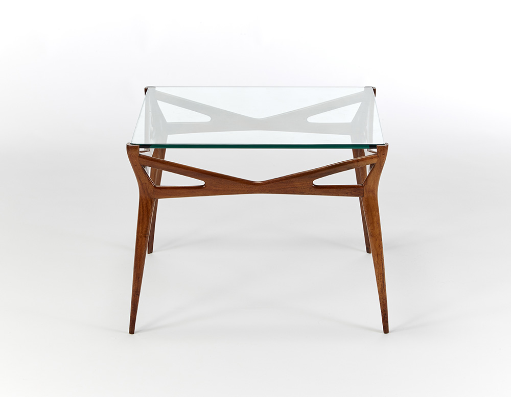 Tavolo basso con struttura in massello di mogano sagomato a formare un traliccio, piano quadrato in cristallo molato. Esecuzione italiana. Cantù, anni '50. (cm 67x51x67)
