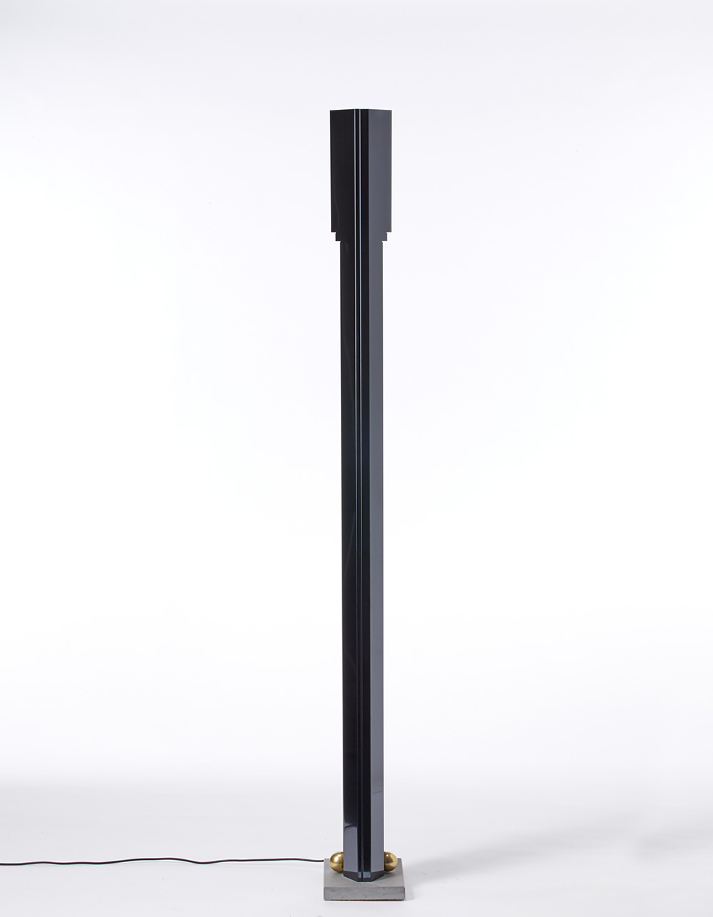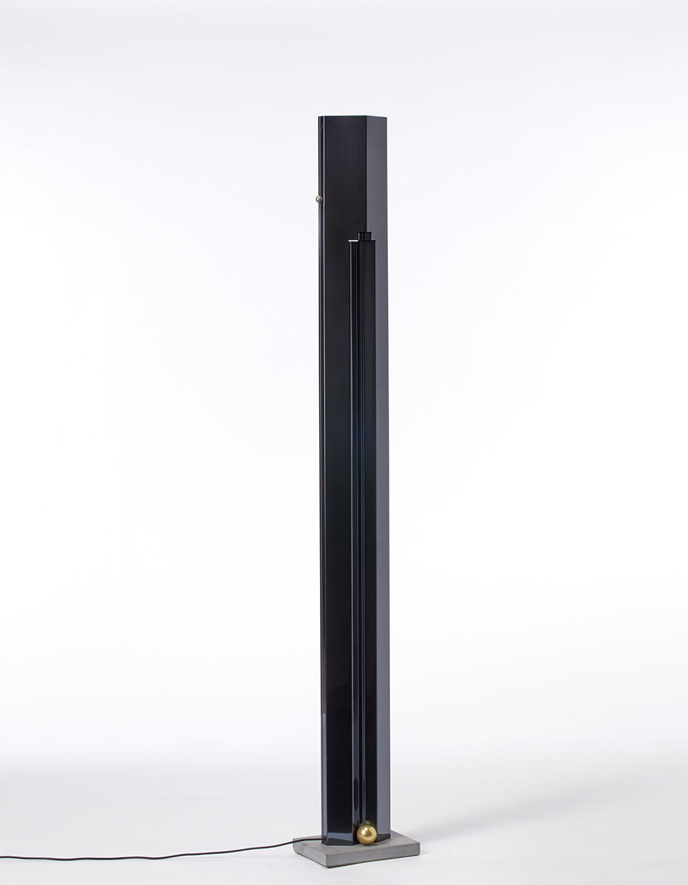* Lampada da terra modello "Totem". Produzione Sirrah, Italia, 1975. Metallo verniciato, ottone, pietra serena. (h cm 181,5)