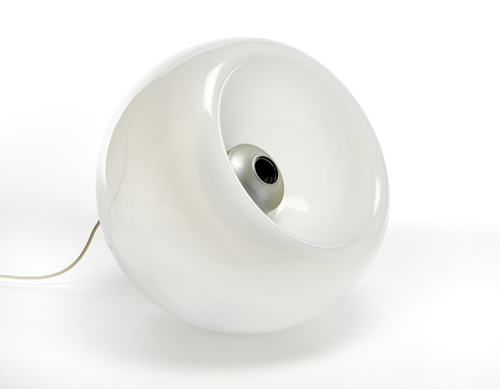 Lampada da appoggio modello "Vacuna". Produzione Artemide, Milano, 1968. Vetro soffiato lattimo e trasparente. (d cm 42)