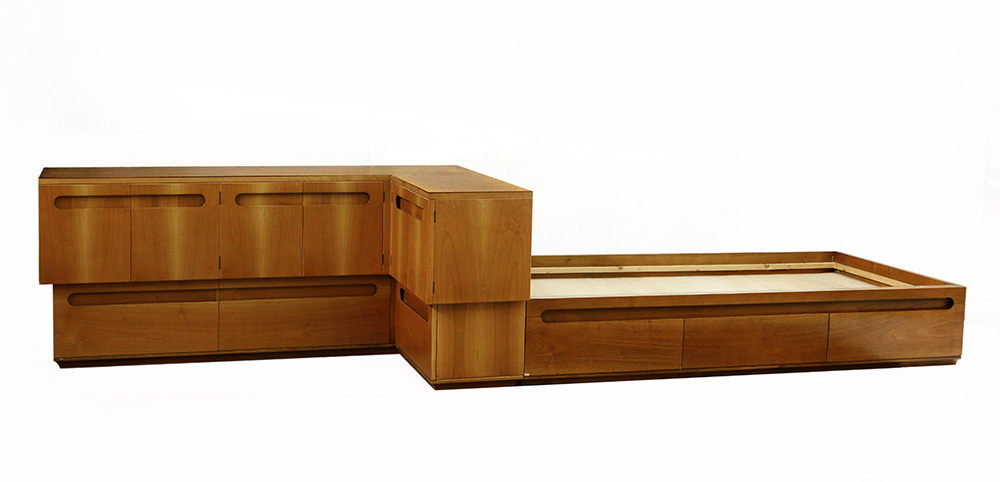 Arredo per camera da letto composto da letto singolo a cassone e mobile contenitore angolare ad ante e cassetti in noce massello e impiallacciato. Milano, anni '60. (Letto cm:200x34,5x94; Mobile contenitore cm: 180x75,5x100) (lievi difetti)