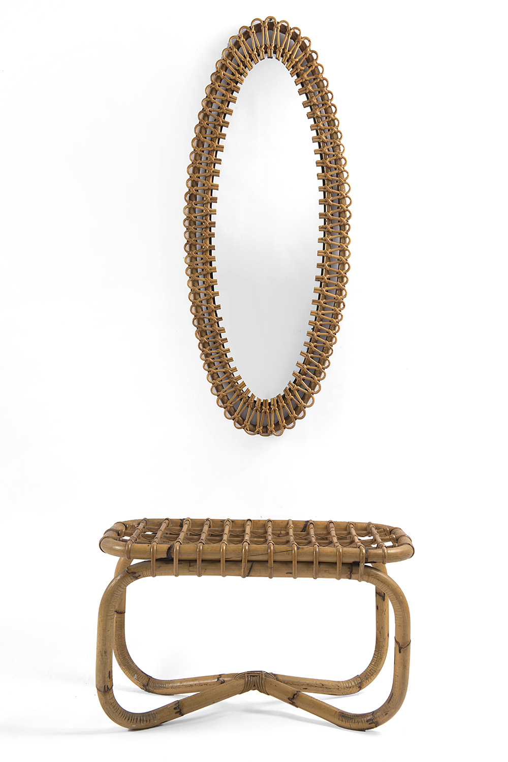 Lotto composto da uno specchio e un tavolino in giunco e malacca. Italia, anni '50. (tavolino: cm 71x40x36; specchio: cm 102x41,5) (lievi difetti)