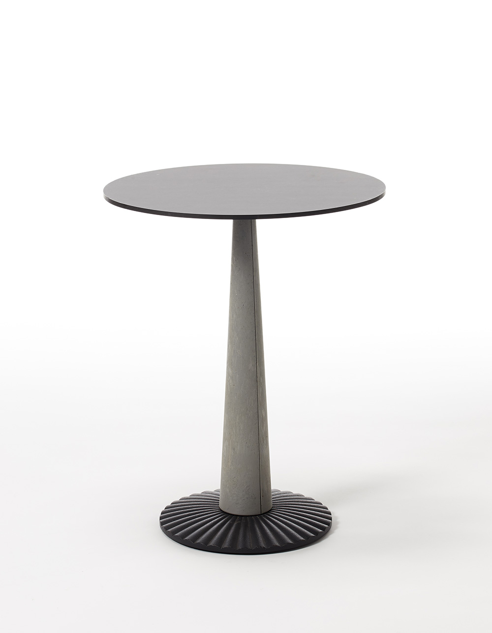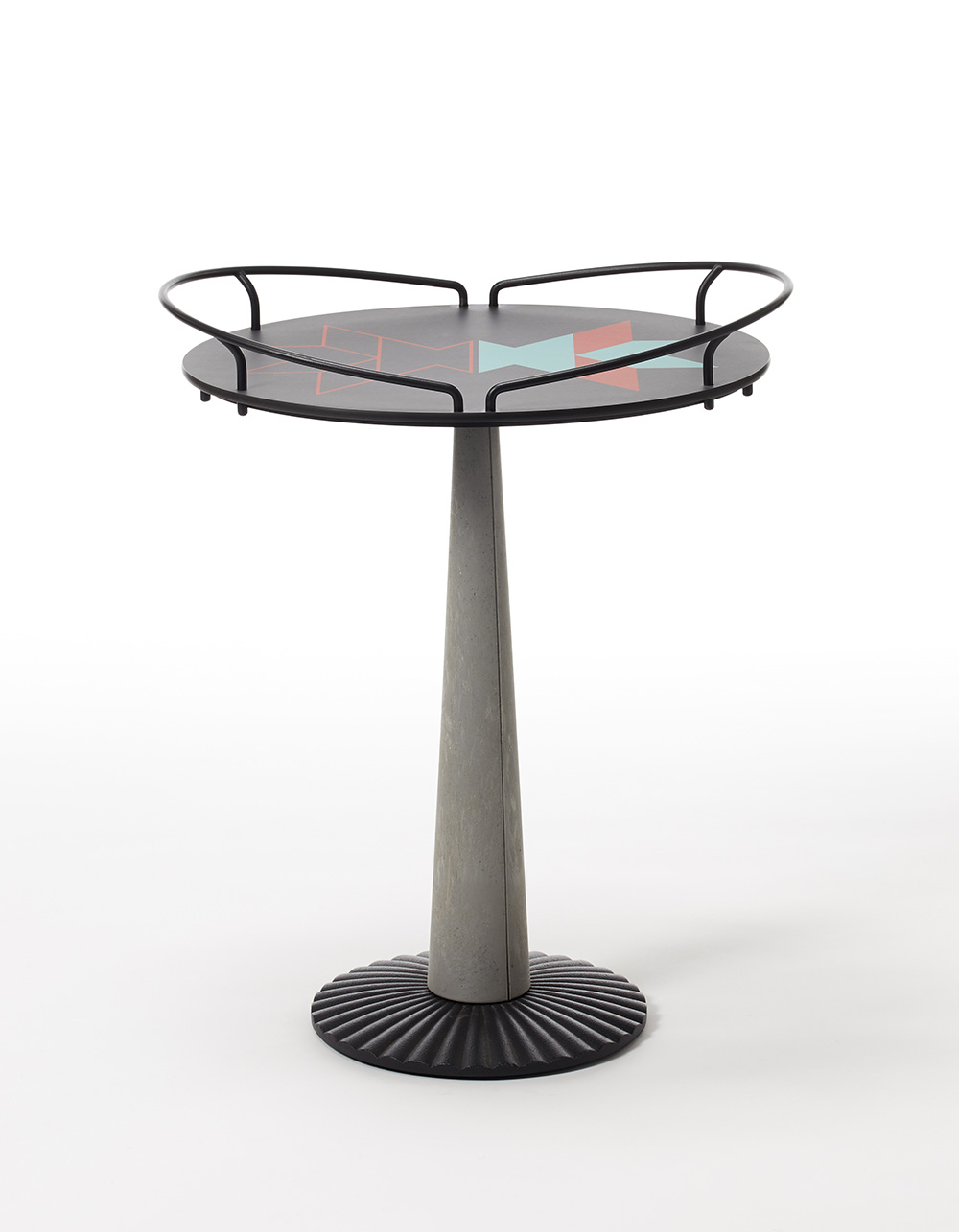 * Small table model "Loto". Produced by Zanotta, Milan, 1990s. Cast iron base, anti-scratch embossed paint, anthracite color; conical element in replex, anthracite-colored recycled plastic with support rod in aluminum alloy, anti-scratch embossed paint, anthracite color; serigraphed tray with polychrome exclusive decoration in red brick and laminated plastic top. (54x66x40 cm.)