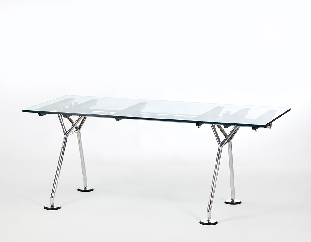 Desk model "Nomos". Produced by Tecno, Varedo, 1980s. Chromed and black painted metal structure, polished glass top. (180x71x80 cm.)