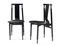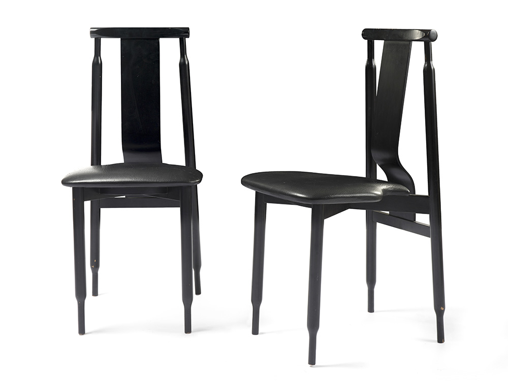 Coppia di sedie modello "Lierna". Produzione Cassina, Meda, anni '70. Legno massello laccato nero, seduta in compensato imbottito in gommapiuma e rivestito in pelle naturale nera. (cm 39x85,5x49) (lievi difetti)