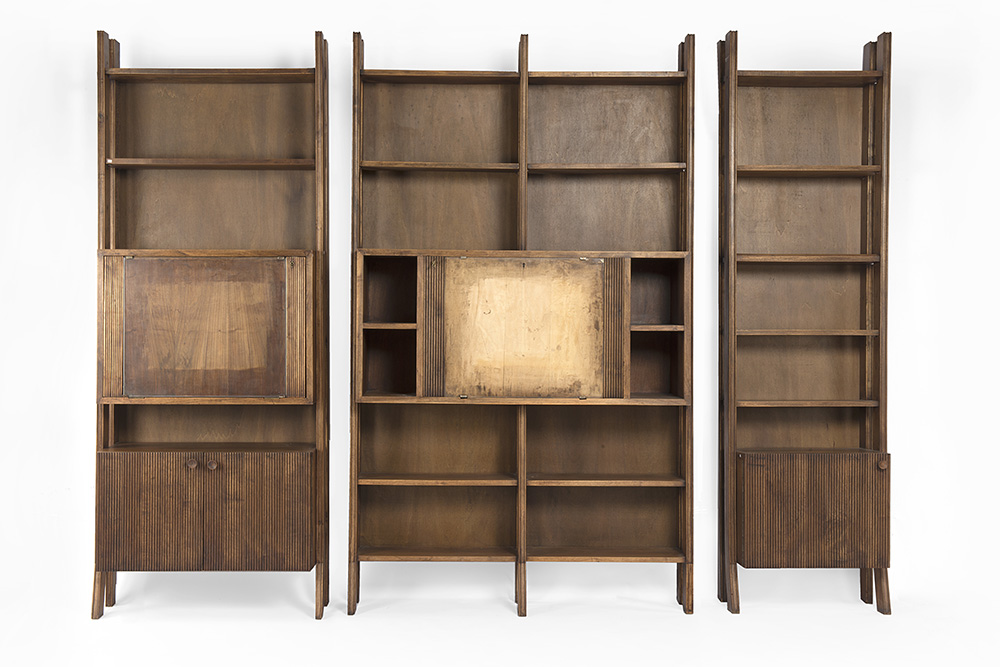 Solid wood and veneered bookcase composed of three elements, open compartments and five doors with a grissinated front, two of which fall front with glass folder. Italy, 1950s. (173.5x230.5x41 cm; 89.5x230.5x41 cm; 61.5x230.5x41 cm) (slight defects and losses)