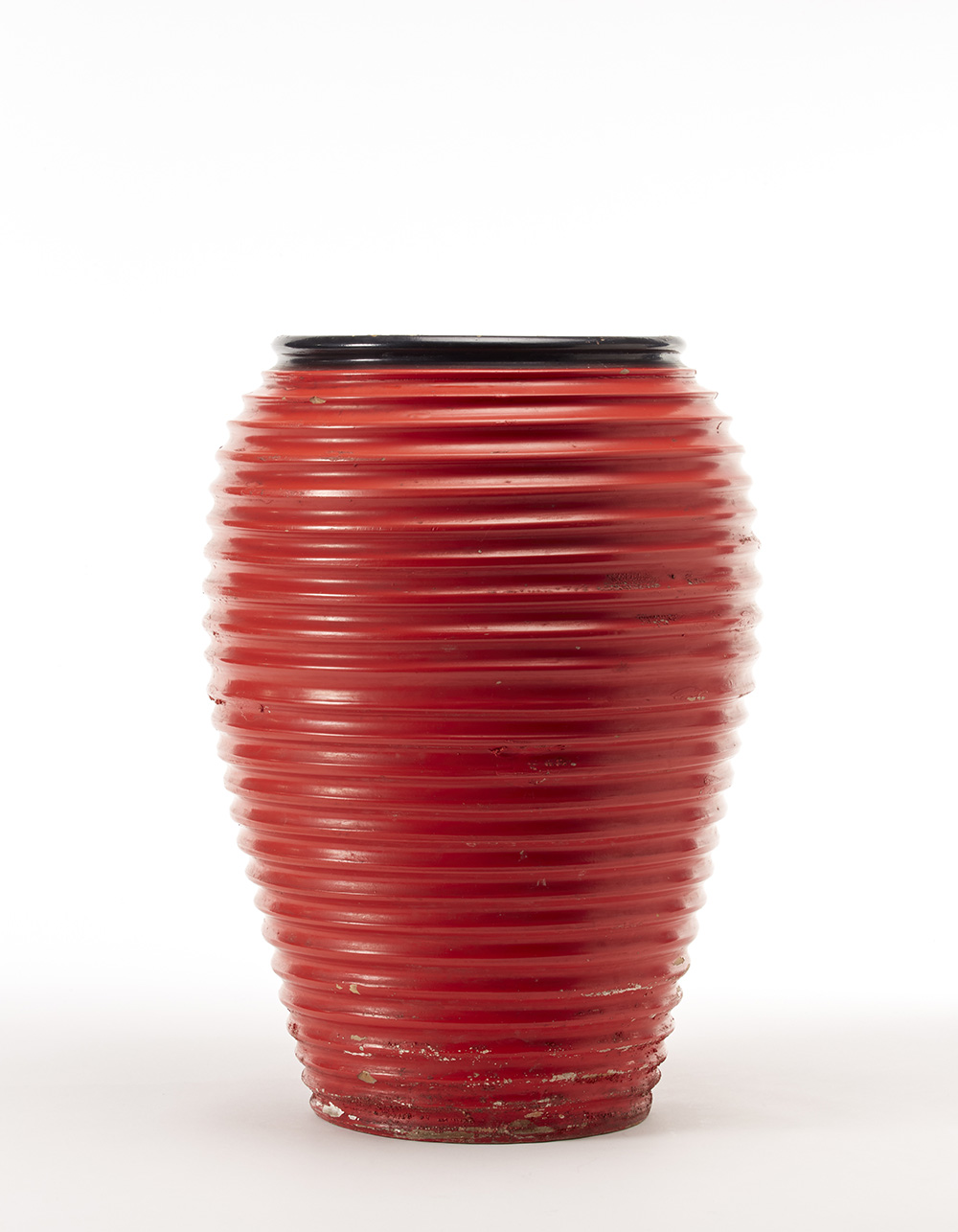 Vaso a scanalature orizzontali rosso con bordo nero. Italia, anni '30. (h cm 47) (difetti e restauri)