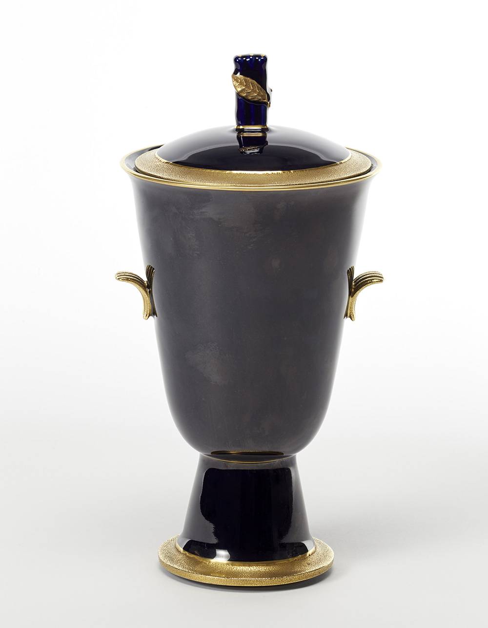 Urn of neoclassical design in porcelain glazed in cobalt blue and hemmed in pure gold. Germany, 1920s. Marked and numbered under the base. (h 34 cm.)