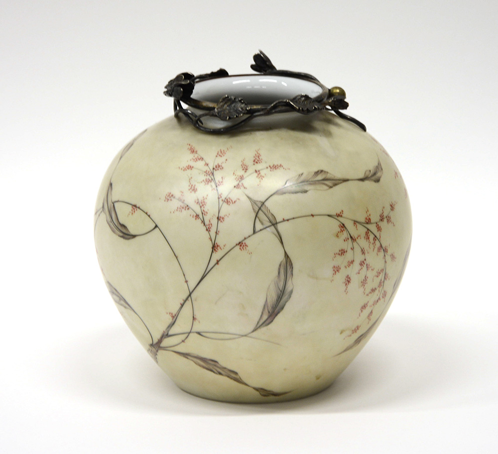 Vaso in porcellana a superficie satinata opaca e leggermente iridata con decori vegetali Art Nouveau, montatura all'orlo in argento. Germania, inizio secolo XX. Marcato con simbolo grafico della manifattura e siglato in rosso con il monogramma "FS" sormontato da corona. (h cm 20)