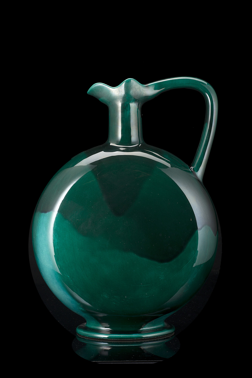 Grande versatoio in ceramica formata a colaggio e smaltata a colature color verde sotto vetrina. Torino, anni '30. Recante firma sotto la base "Lenci ITALY". (h cm 49)
