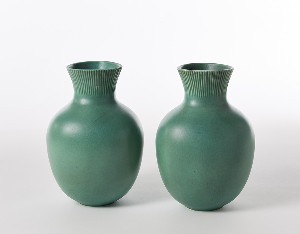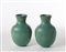 Coppia di vasi in ceramica smaltata in verde opaco modello "6573". Esecuzione Richard - Ginori S. Cristoforo, Milano, anni '30. Marcati sotto la base in verde "Richard Ginori Made in Italy" e con il simbolo grafico della manifattura. Numerale 6575 incusso, numerale 889 in nero. (h cm 26,5) (lievi difetti)