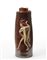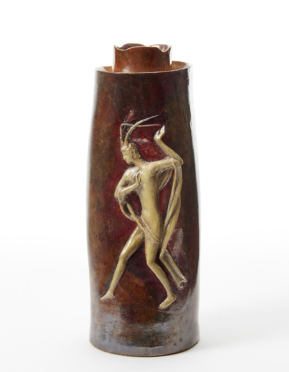 Vaso di forma cilindrica irregolare decorata con figura umana a rilievo e smaltata in policromia e a lustri metallici nei toni del rosso, dell'ocra, dell'ametista e del bruno. Anni '50/'60. Firmato "MELANDRI" sotto la base. (h cm 32,5) (difetti e restauri)