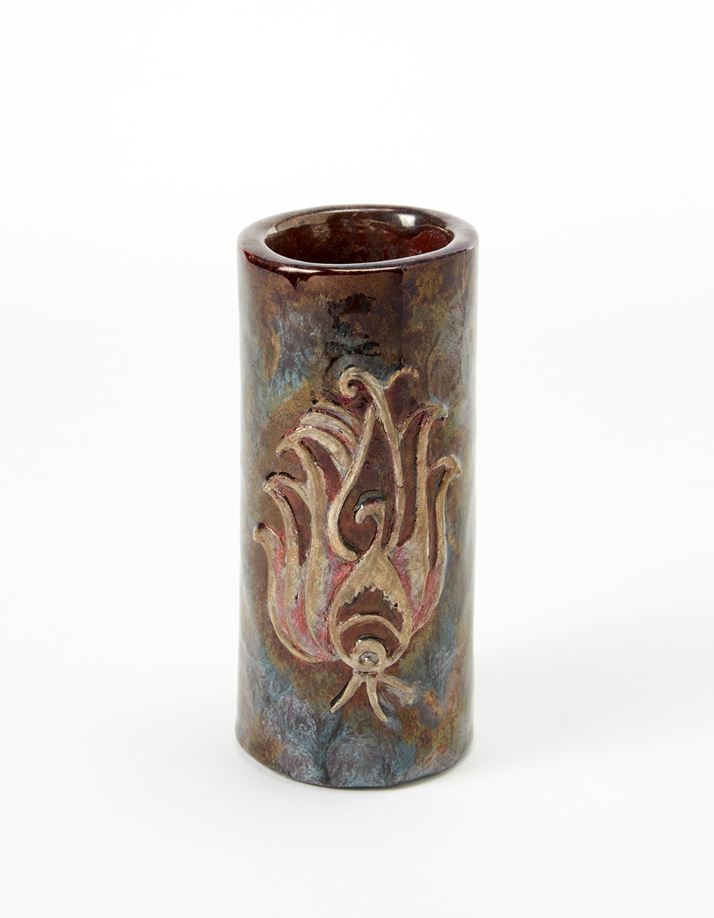 Vasetto cilindrico in ceramica, smaltato in policromia, a lustri metallici e decorato con due figure fitomorfe a rilievo. Faenza, anni '50/'60. Firmato "MELANDRI" e con il monogramma della "M" riquadrata. (h cm 14,3) (lievi difetti)