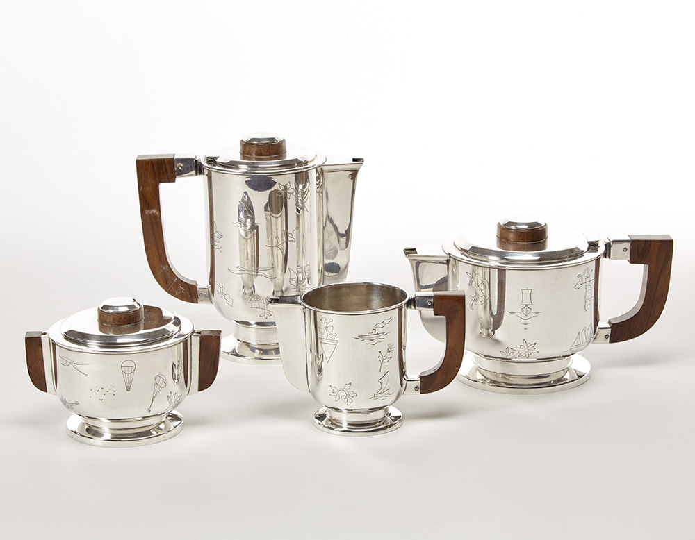 Servizio da té e caffé in argento e legno composto da una teiera, una caffettiera, una zuccheriera e una lattiera titolato 800. Alessandria, 1927-1935ca. Marchio "Rec". (gr 2200)