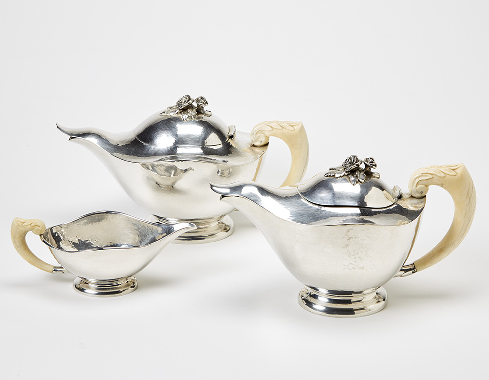 Lotto composto da una una teiera, una caffettiera e una lattiera in argento martellinato con manici in osso intagliato e coperchi decorati con rose sbalzate. Milano, anni '20/'30. Argento titolato 800, recante punzone di epoca fascita e simbolo grafico della manifattura. (misure varie) (lievi difetti)