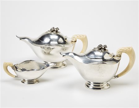 Lot consisting of a silver teapot, coffeepot and milk jug with carved bone handles and lids decorated with embossed roses. Milan, 1920s/1930s. Silver titled 800, bearing the hallmark of the Fascist era and the graphic symbol of the manufacture. (various measures) (slight defects)