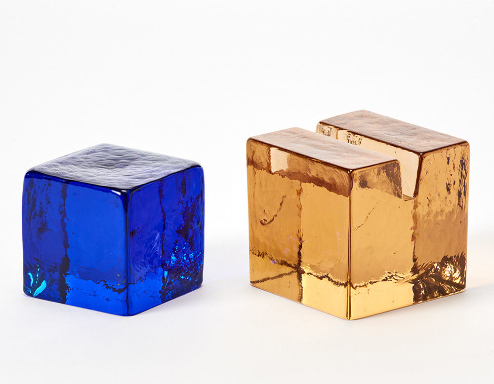Lotto di due fermacarte in vetro massello arancio e blu. Firmati a punta e datati sotto la base rispettivamente 1981 e 1985. (cm 7x7x7; cm 6x6x6)