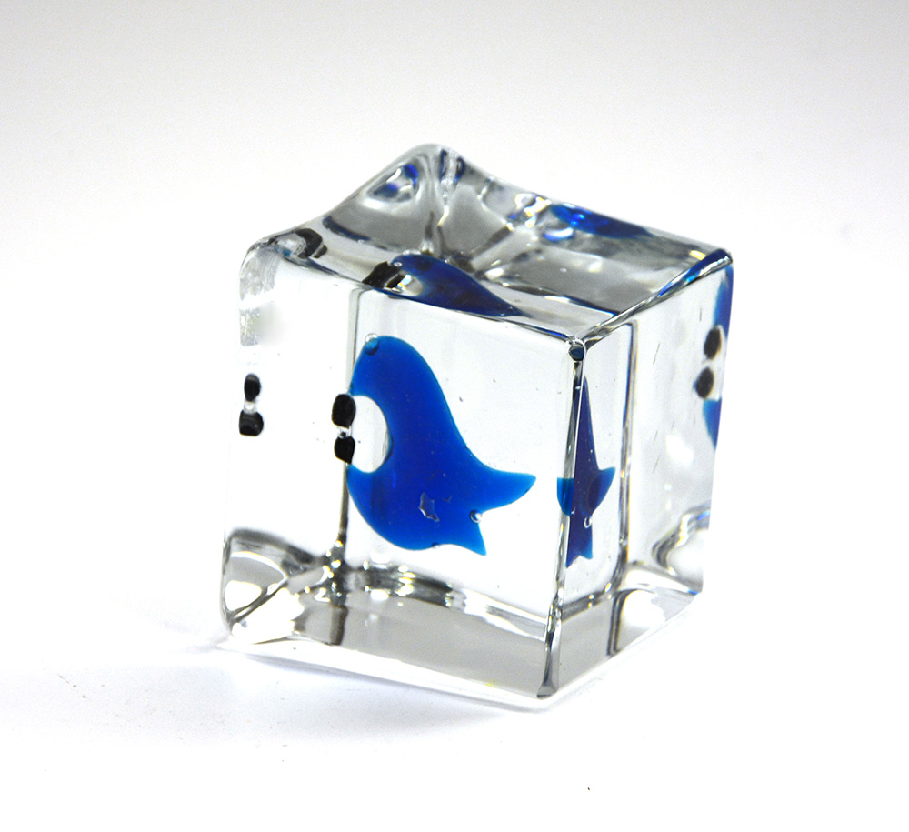 Scultura fermacarte in vetro massello con inclusione di vetro blu e nero. Murano, seconda metà secolo XX. Firmato a punta "Seguso Murano". (cm 9x9x9,5)