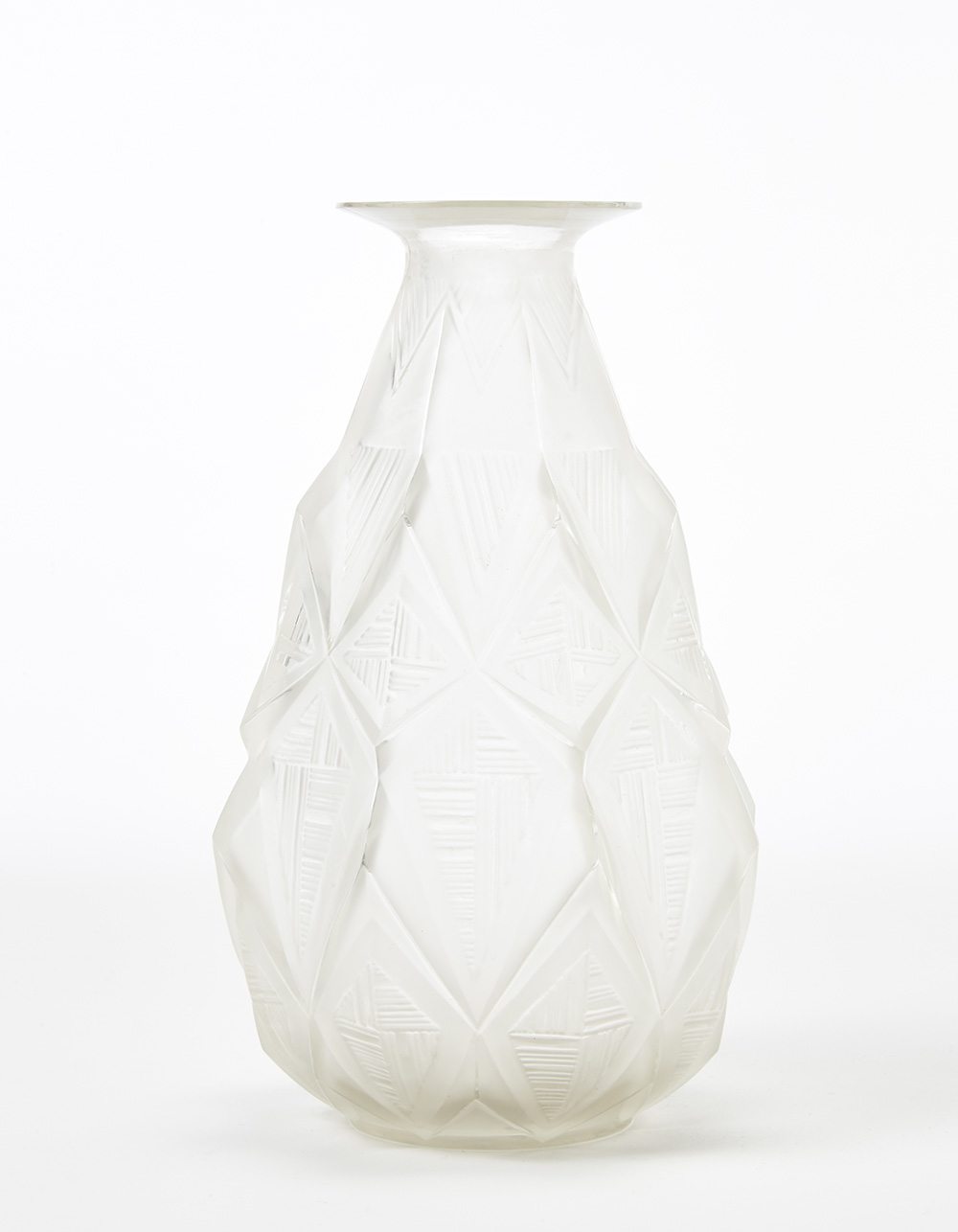 Vaso déco in vetro incolore soffiato in stampo e acidato sulla superficie esterna. Francia, 1925ca. Firmato a punta sotto la base "Sabino France". (h cm 21,5) (lievi difetti)