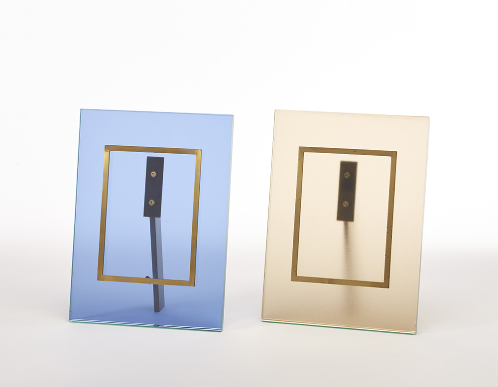 Coppia di cornici portafoto in metallo e vetro modello "2426 e 2426a". Milano, anni '50. Cristallo molato, colorato e satinato, montatura di ottone. (cm 30x22) (difetti)