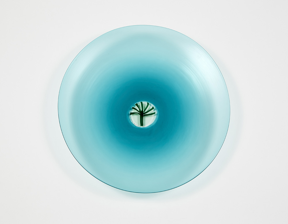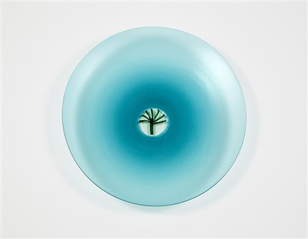 Piatto di murrine della serie "Quattro stagioni - primavera". Venini, Murano, 1976. Vetro soffiato trasparente verde e battuto sulla superficie esterna con grande murrina al centro raffigurante un albero in cristallo e verde. Firmato e numerato a punta al retro "venini italia Laura 100/52" Premiati nel 1979 alla mostra "New glass '79 - Worldwide Survey". (d cm 37)