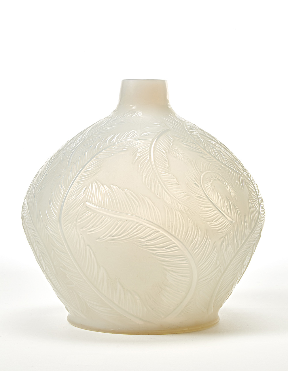 Vaso modello "Plumes". Esecuzione Lalique, Francia, 1920-1947 (disegno del 1920). Vetro bianco opalescente soffiato in stampo, molato e acidato sulla superficie esterna. Firmato e numerato sotto la base "R. Lalique France 96:944". (h cm 20,5) (lievi difetti)
