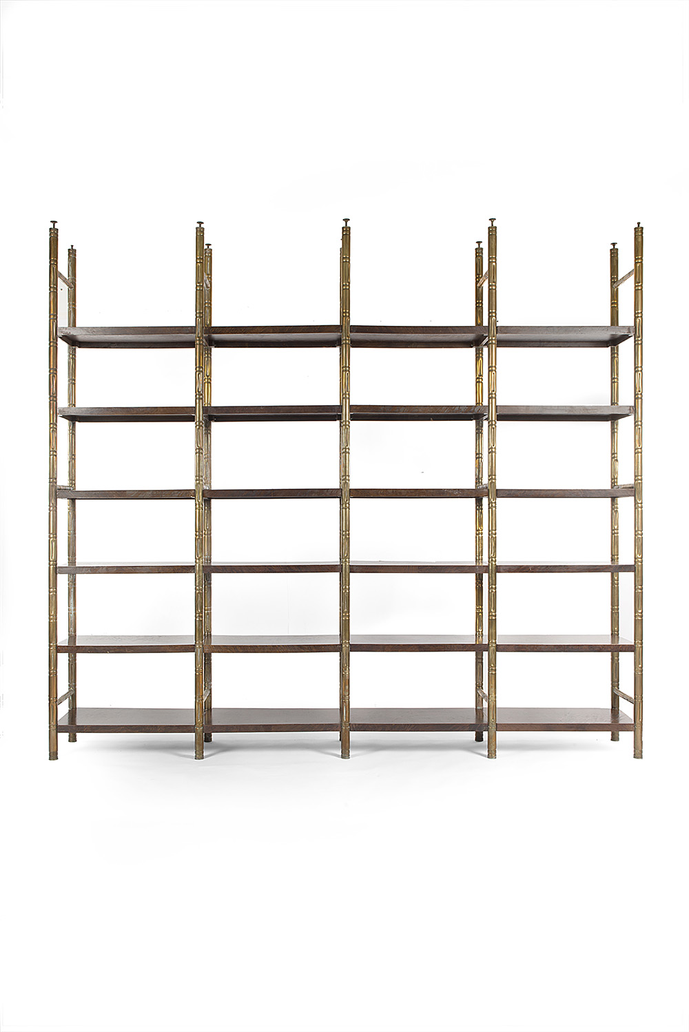 Libreria a giorno con montanti in ottone lucidato simulante il bamboo e...
