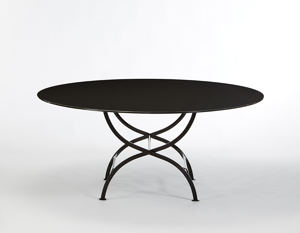 Tavolo modello "Nonaro". Produzione Azucena, Italia, anni '80. Legno laccato grigio struttura in ferro verniciato grigio. (h cm 74,5; d cm 170) (difetti)