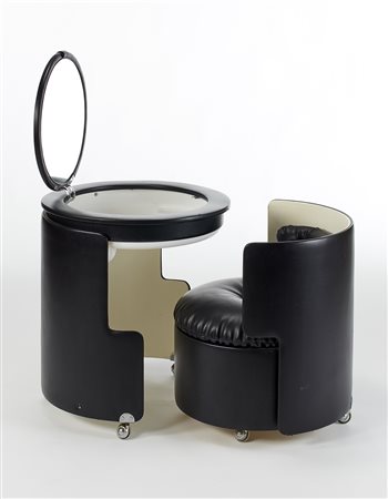 Mini toilette modello "Dilly Dally". Produzione Poltrona Frau, Italia, 1968. Similpelle nera e struttura portante in resina bianca e metallo. (h cm 74; d cm 65,5) (difetti)