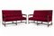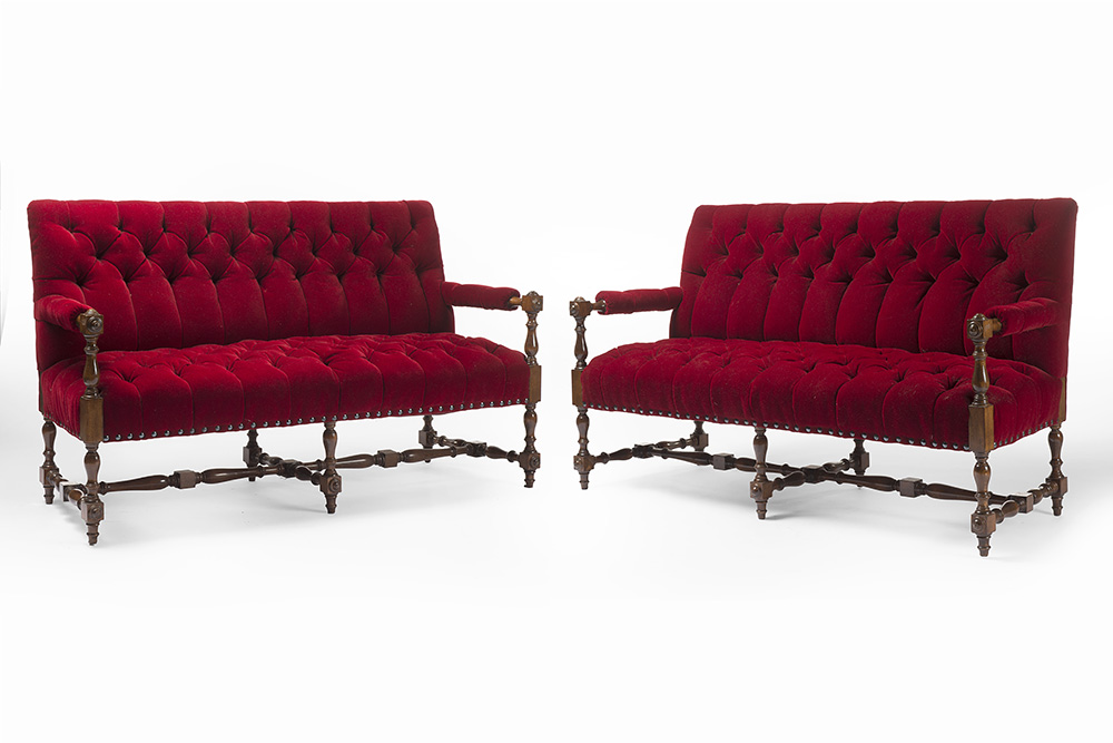 Pair of sofas with special "1st class" velvet Ferrovie dello Stato. 1950s. Structure in solid walnut wood, upholstered in red velvet. (155x94x60 cm.) (slight defects and losses)