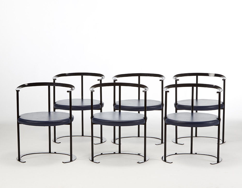Sei poltroncine modello "P4 Catilina piccola". Produzione Azucena, Milano, dal 1962. Seduta in pelle blu e struttura in metallo laccato nero. (cm 54x70,5x46) (difetti)