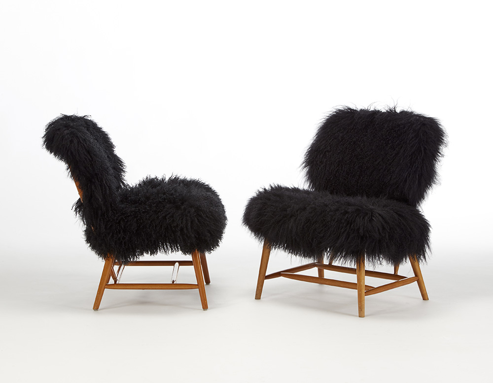 Coppia di poltroncine modello "Te-Ve". Produzione Ljungs Industrier della serie Studio, Svezia, anni '50. Struttura in legno massello e rivestimento in vera pelle di agnello della Mongolia a pelo lungo. (cm 63x71,5x60) (lievi difetti)