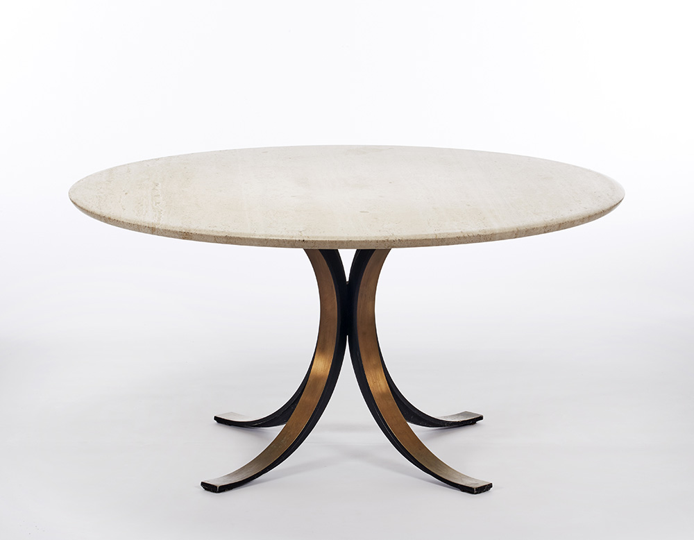 Tavolo basso modello "T69". Produzione Tecno, Varedo, 1964. Piano circolare in travertino struttura in alluminio pressofuso. (h cm 66; d cm 120) (lievi difetti)
