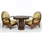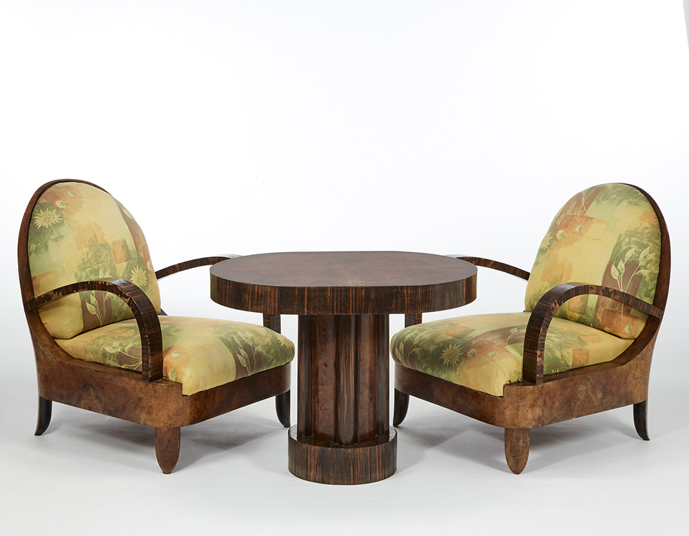 Salottino composto da due poltrone un tavolino in legno massello e impiallacciato in radica e zebrano. Sedute e schienali imbottiti rivestiti in tessuto originale dell'epoca stampato a motivi geometrici e floreali policromi. 1931. (poltrone: cm 72x88,5x77; tavolino: cm 90x69x60,5) (difetti)