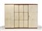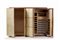 Large wardrobe with five doors. Italy, 1940s. Veneered, bordered mahogany structure covered in parchment. Central doors concealing an opening mirror, right wing concealing drawers in maple wood and glass, door on the left concealed cloth hanger. (243.5x185x65 cm.) (defects and restorations)