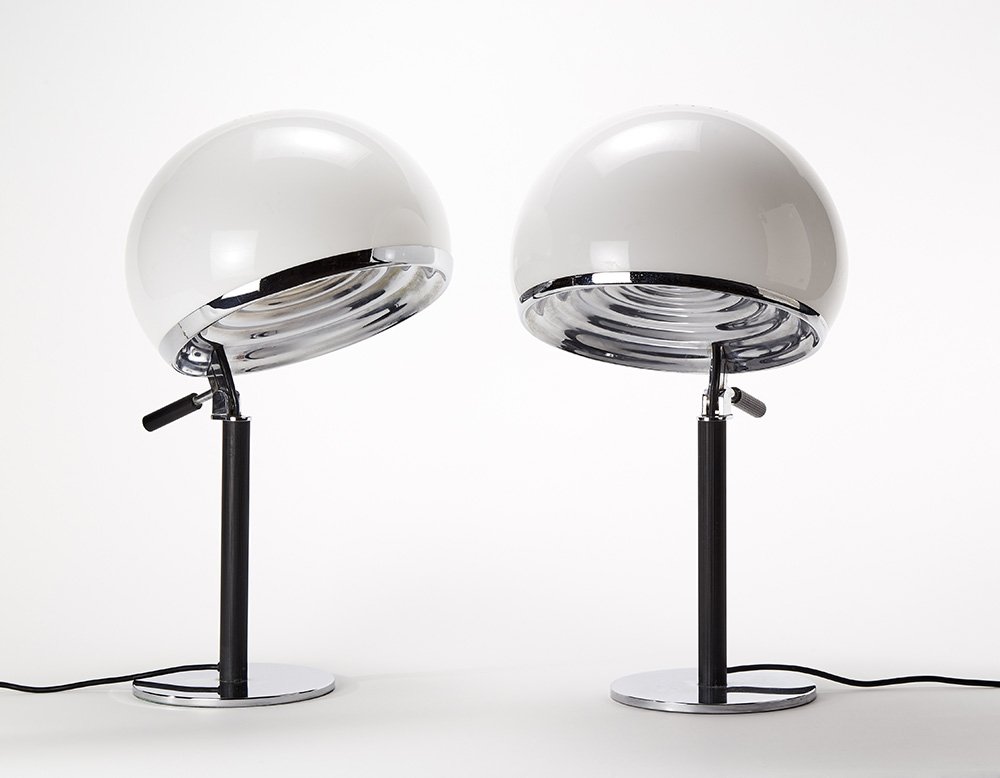 Coppia di lampade da tavolo modello "Bino". Produzione Candle, Italia, 1969. Metallo cromato, plastica nera metilmetacrilato opalino. (h cm 56) (lievi difetti)