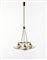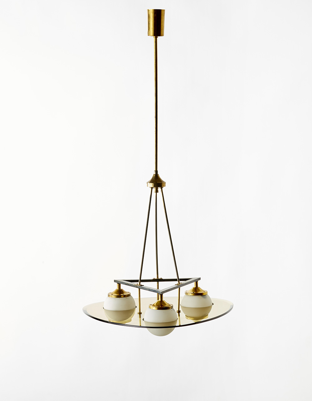 Lampada a sospensione a tre luci con struttura in tondino e tubolare di ottone lucidato e verniciato nero. Disco di forma triangolare stondata in cristallo molato ambrato, globi diffusori in vetro incamiciato lattimo satinato. Italia, anni '50/'60. (h cm 96) (lievi difetti)