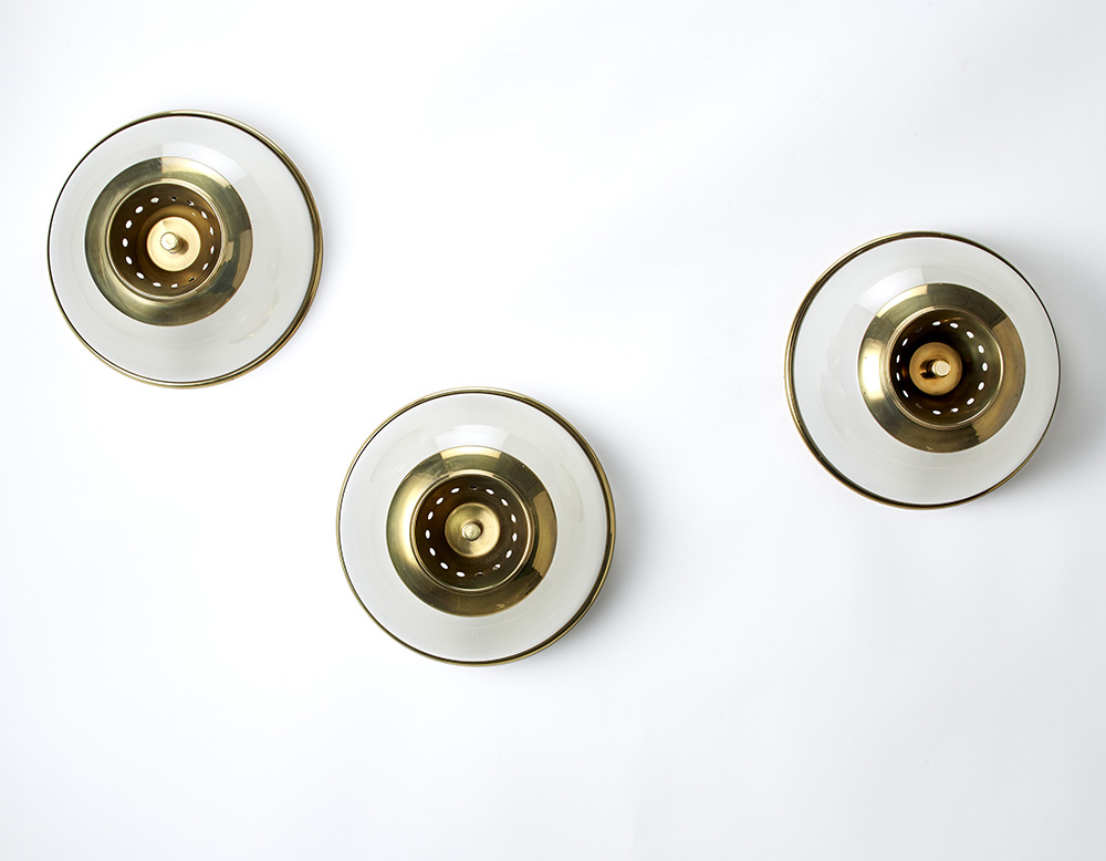 Tre plafoniere modello "LPS3 Mezzopallone". Produzione Azucena, Milano, dal 1960. Ottone, mezzo globo in vetro satinato internamente, calotta inferiore con fori. (h cm 16,5; d cm 31,5) (lievi difetti)