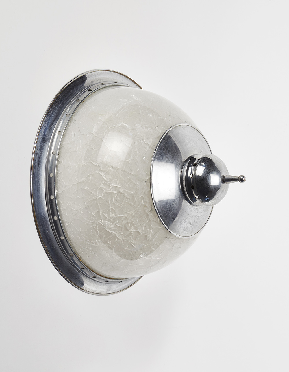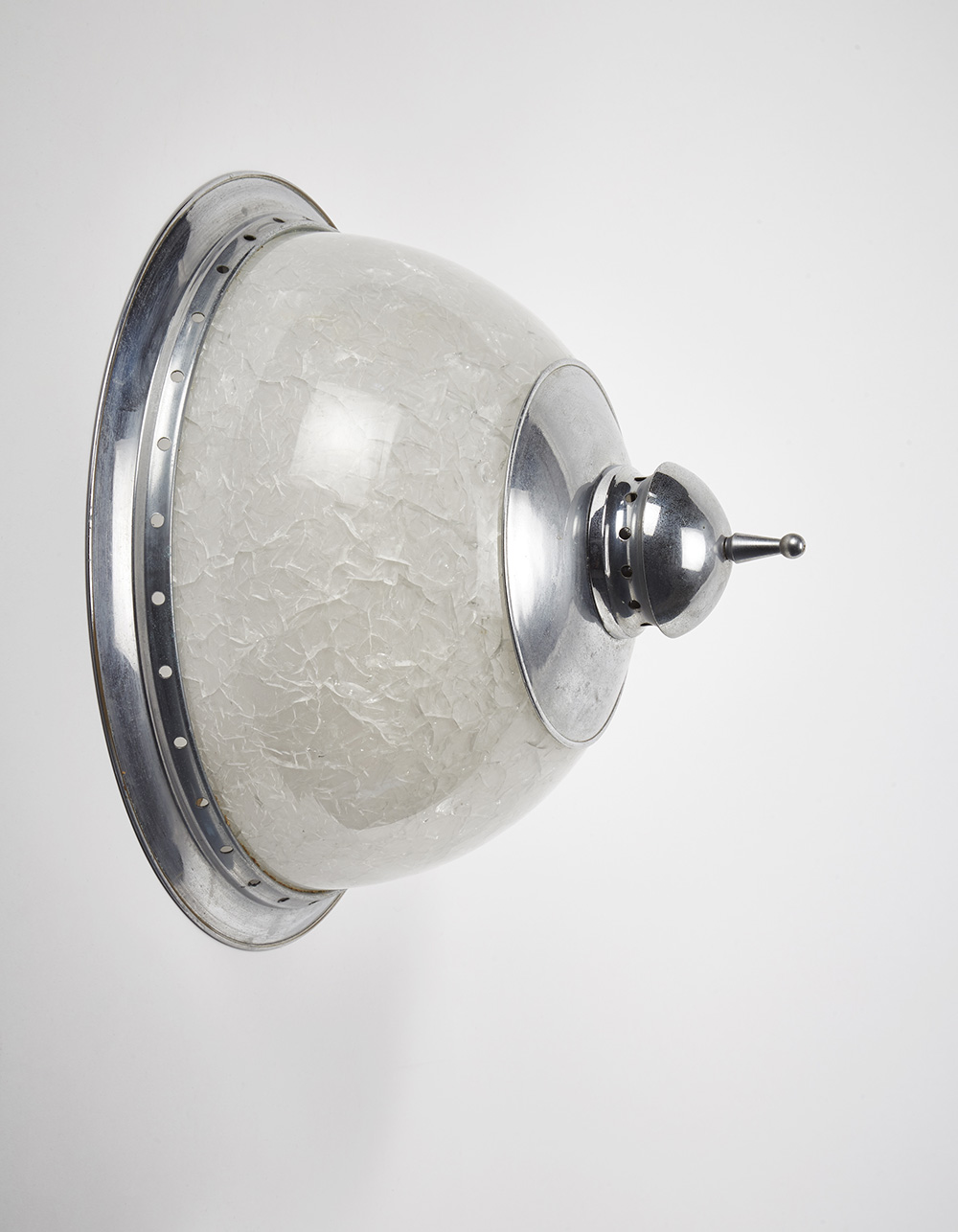 Plafoniera modello "Mezzo lampione". Produzione Azucena, Milano, anni '60. Ottone nichelato con paralume in vetro craquelé sulla superficie interna. (h cm 26; d cm 35,5) (difetti)