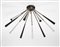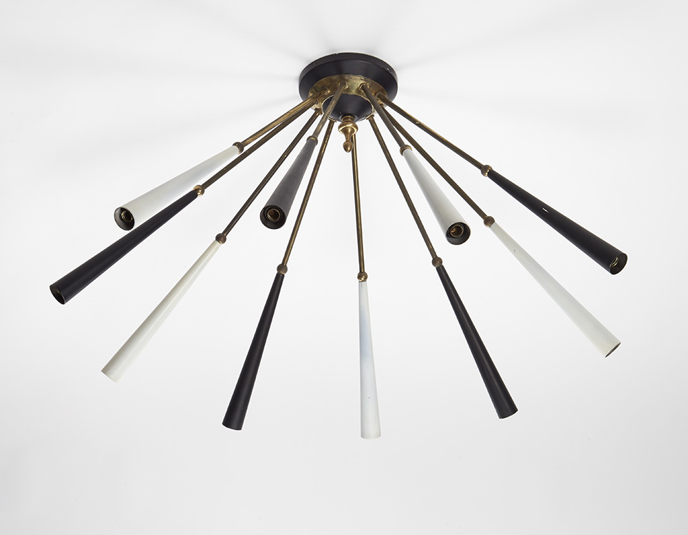 Plafoniera a dieci braccia tipo Sputnik in ottone lucidato e alluminio verniciato bianco e nero. Terminali portalampadine di forma troncoconica. Italia, anni '50. (h cm 40; d cm 69) (lievi difetti)