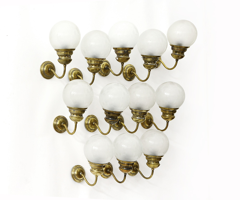 Dodici lampade da parete modello "LP1 Lampione". Produzione Azucena, Milano, dal 1950. Ottone e vetro soffiato sulla superficie interna. (l cm 37) (lievi difetti)