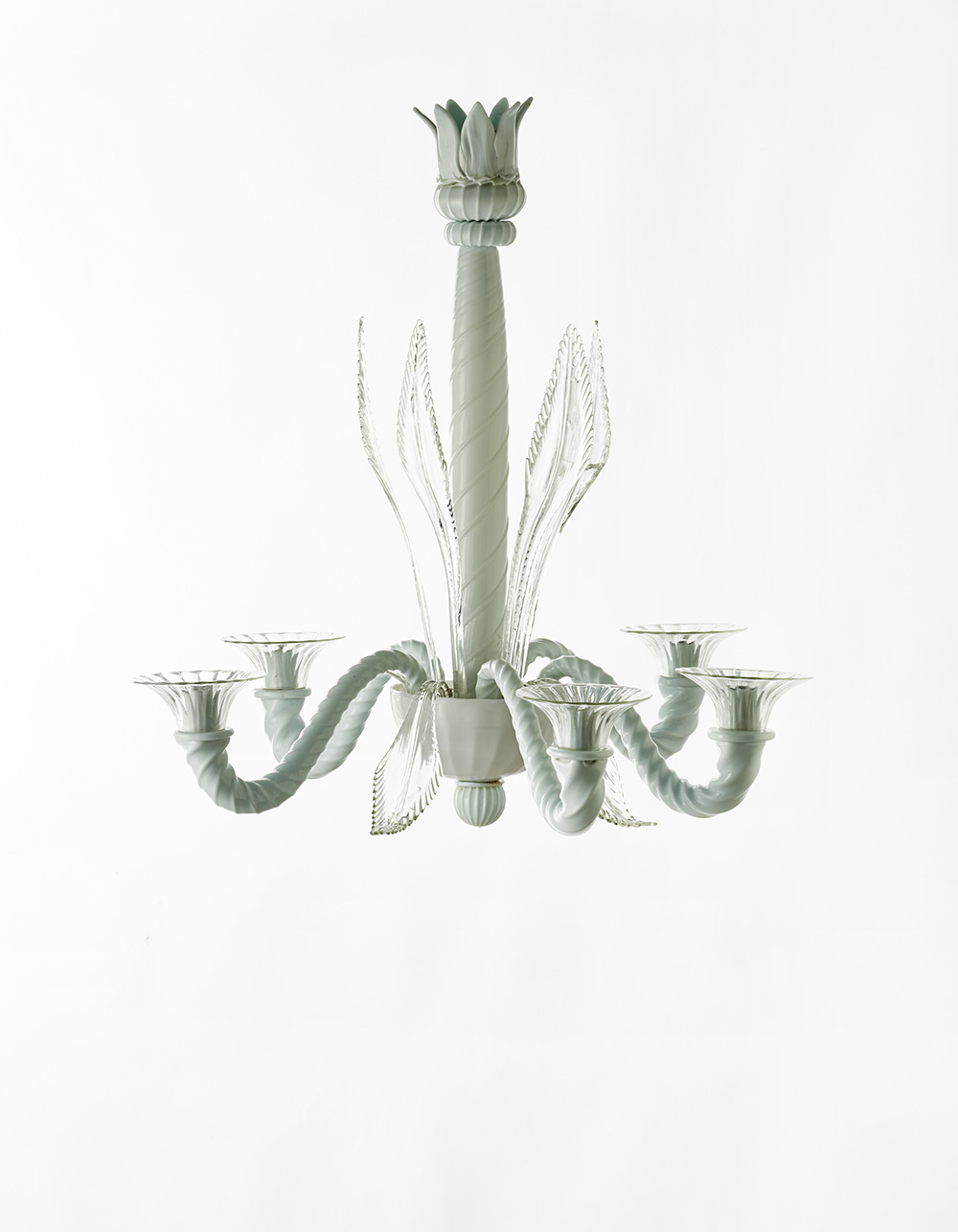 Lampadario cinque fiamme in vetro soffiato lattimo, con fusto e braccia a costolature ritorte, foglie e coppe costolate in vetro incolore. Murano, anni '20/'30. Corrispondente al disegno di fornace Venini 5102 e al disegno 5068 del catalogo blu Venini. (h cm 70,5; d cm 71) (difetti e mancanze)