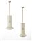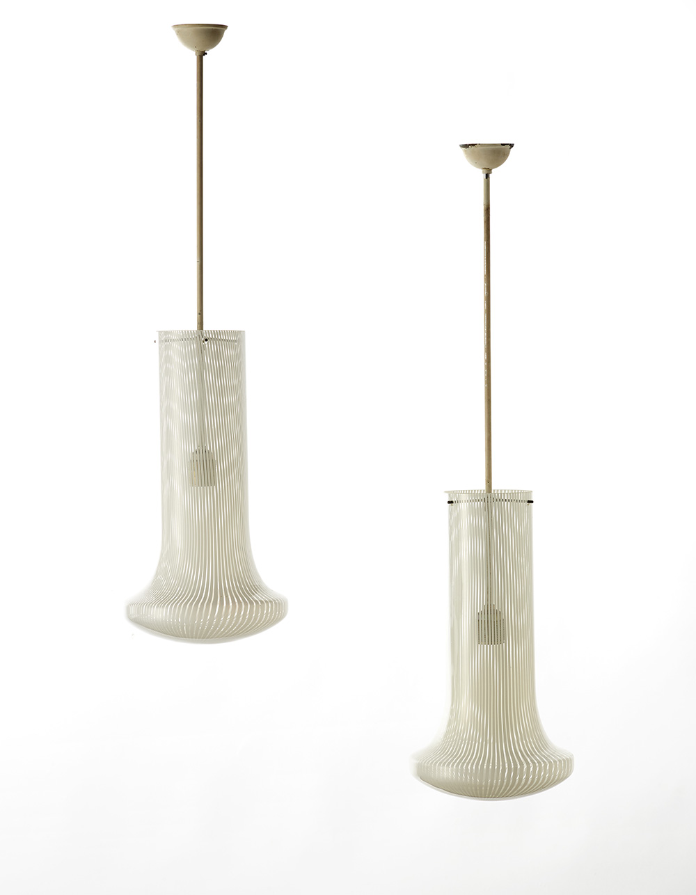 Coppia di lampade da soffitto della serie "Boletus". Murano, anni '70. Vetro soffiato a canne lattimo e incolore, montatura in ottone verniciato bianco. (h cm 84,5) (lievi difetti)
