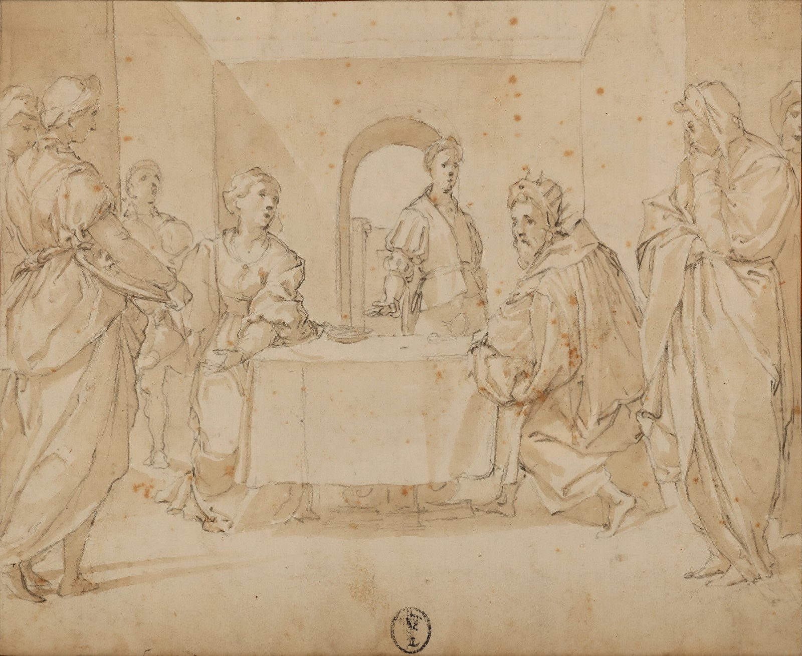 ARTISTA ITALIANO DEL XVII SECOLO Figure in un interno. China e matita su carta. Cm 23,50 x 20,00. Tracce di timbro in basso.