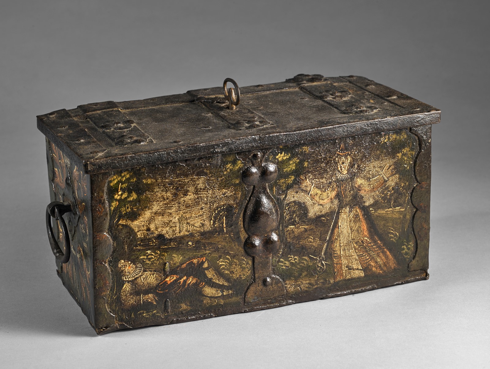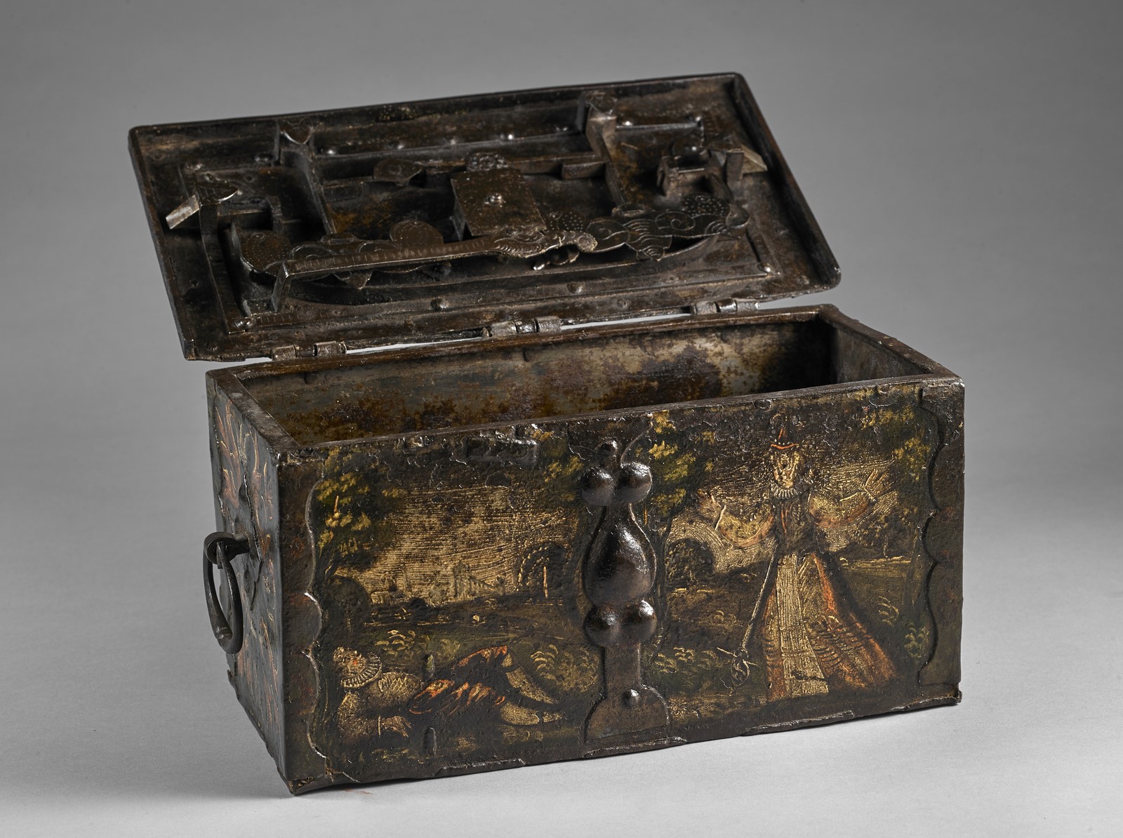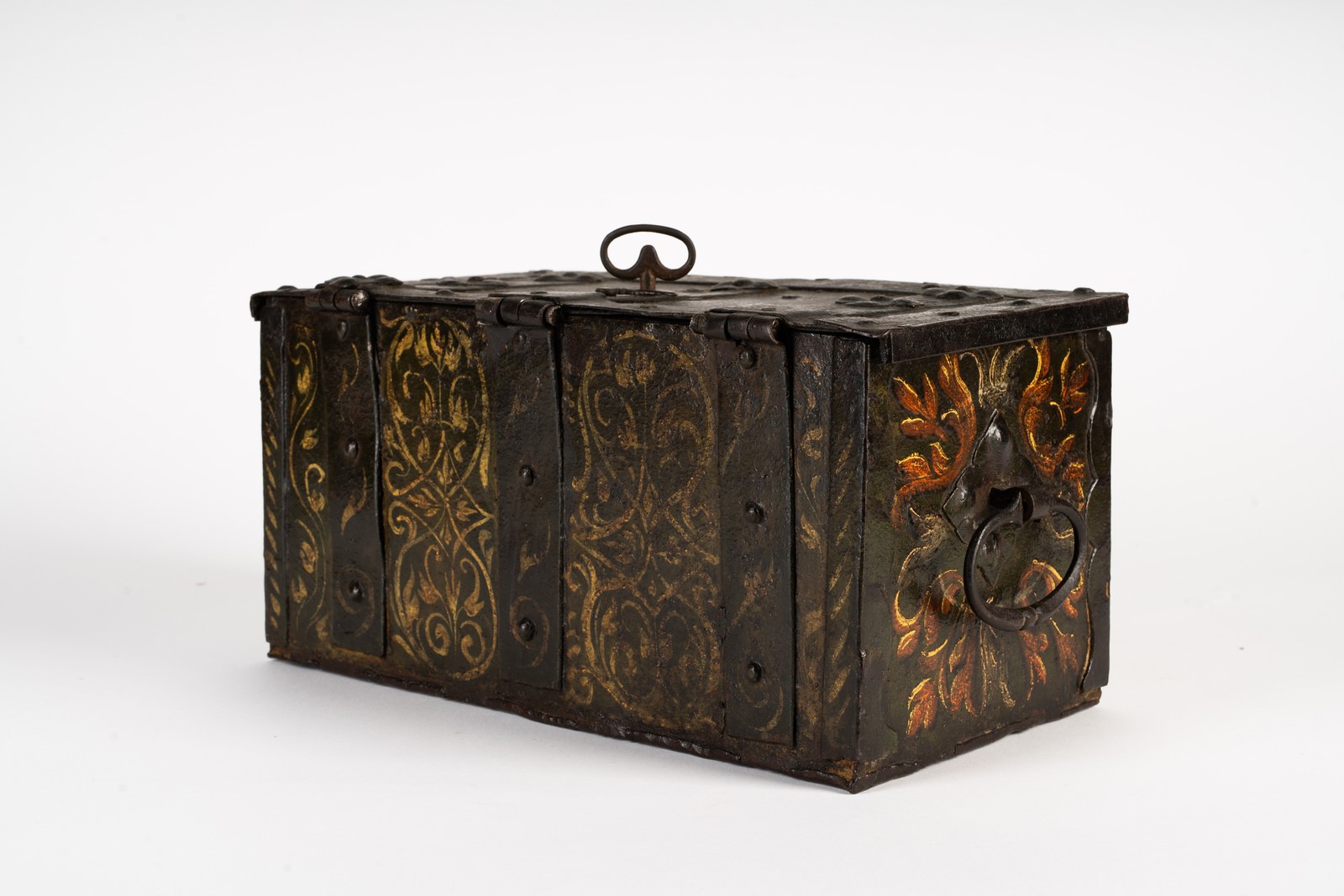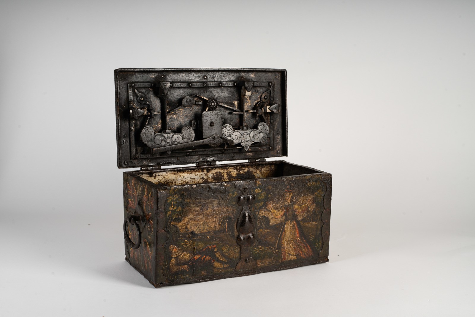MANIFATTURA TEDESCA DEL XVI SECOLO Piccolo forziere in ferro dipinto in...