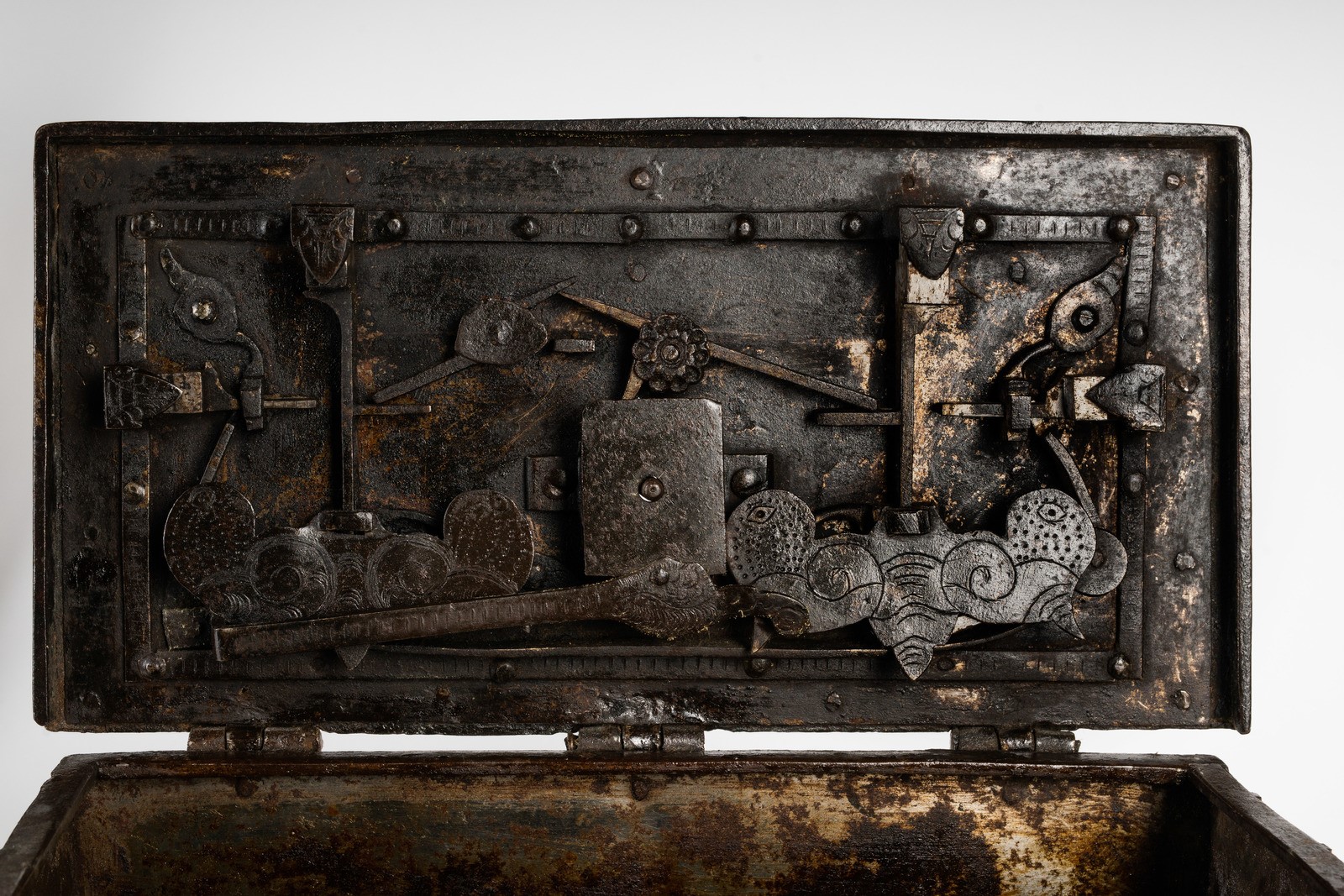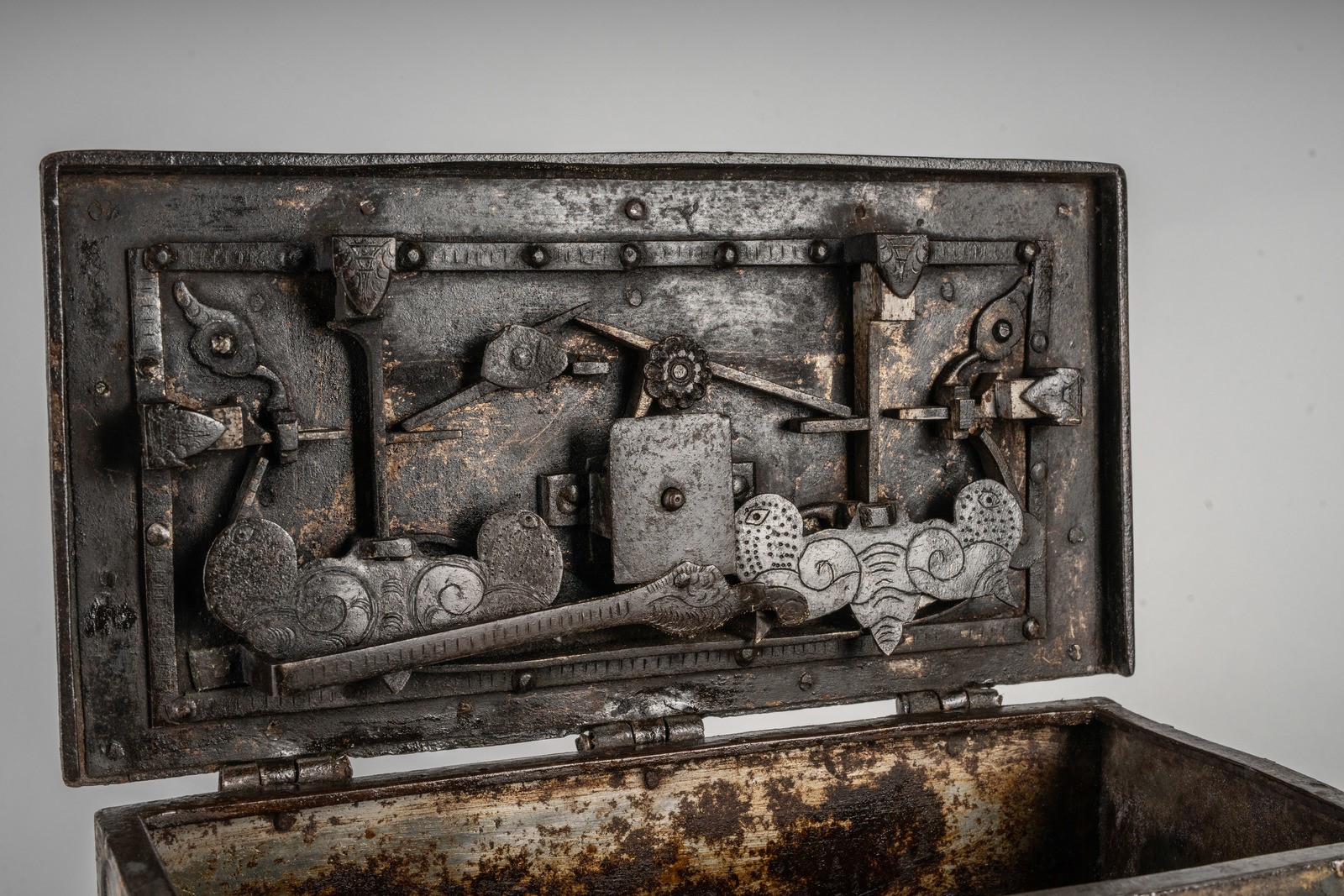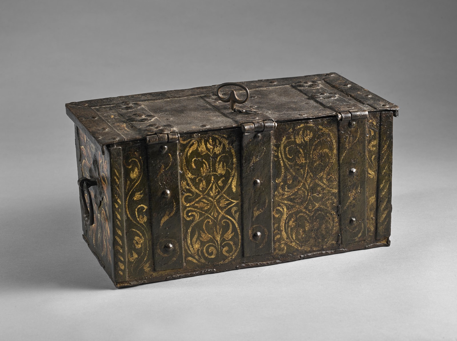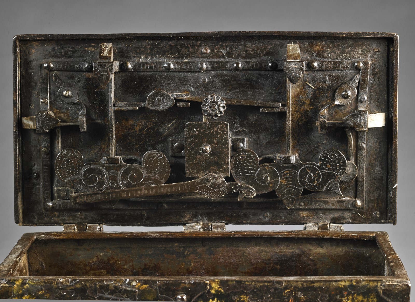 MANIFATTURA TEDESCA DEL XVI SECOLO Piccolo forziere in ferro dipinto in...