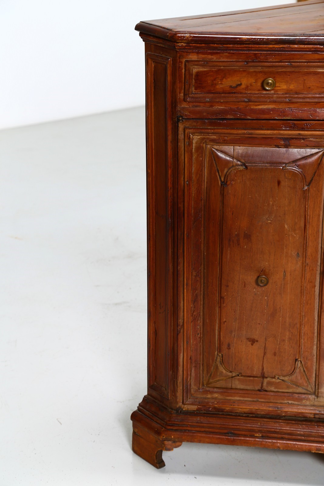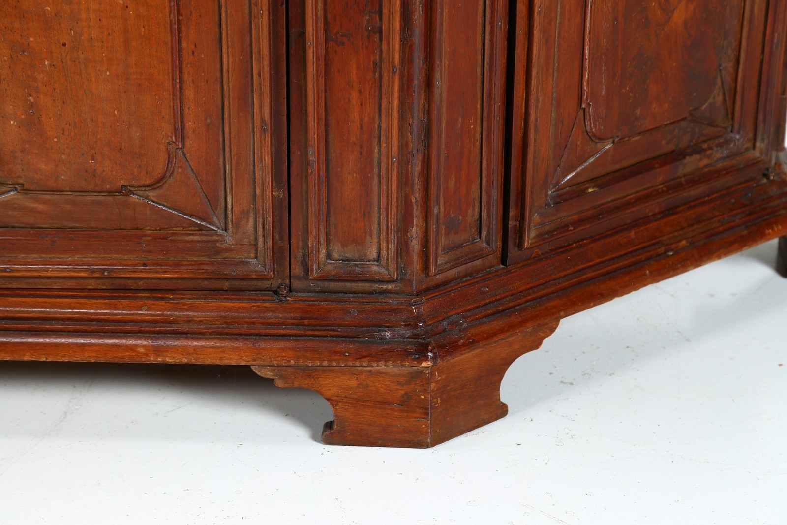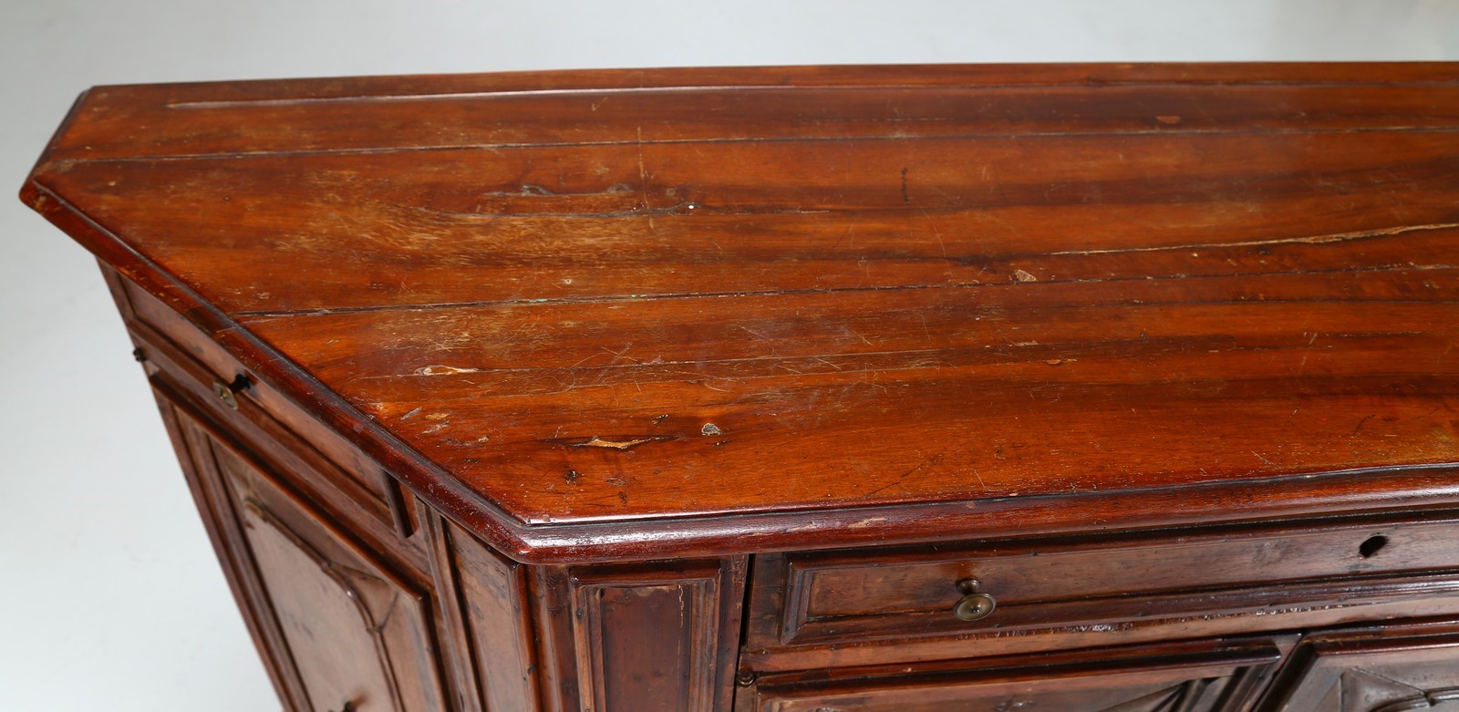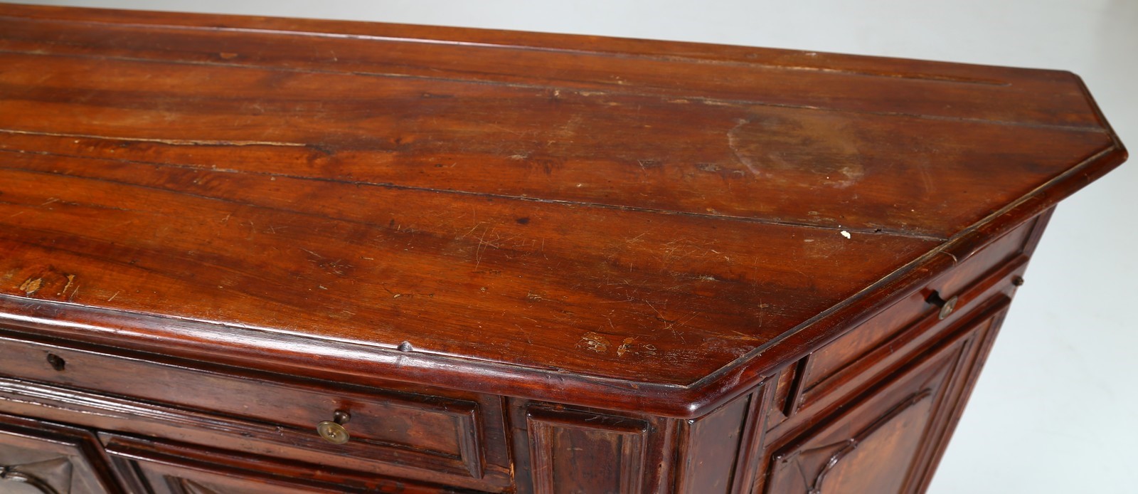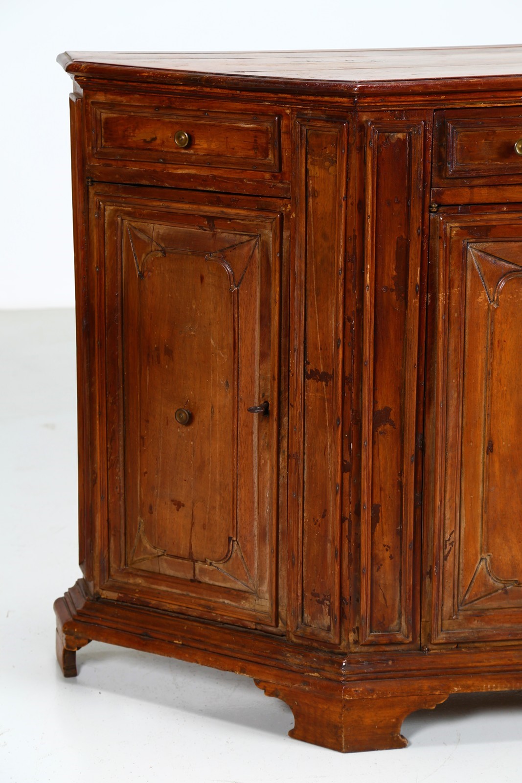MANIFATTURA DEL XIX SECOLO Credenza in legno di noce. . Cm 186,00 x 104,00 x 50,00. A quattro ante e quattro cassetti. Pomoli dei cassetti in bronzo. Restauri.