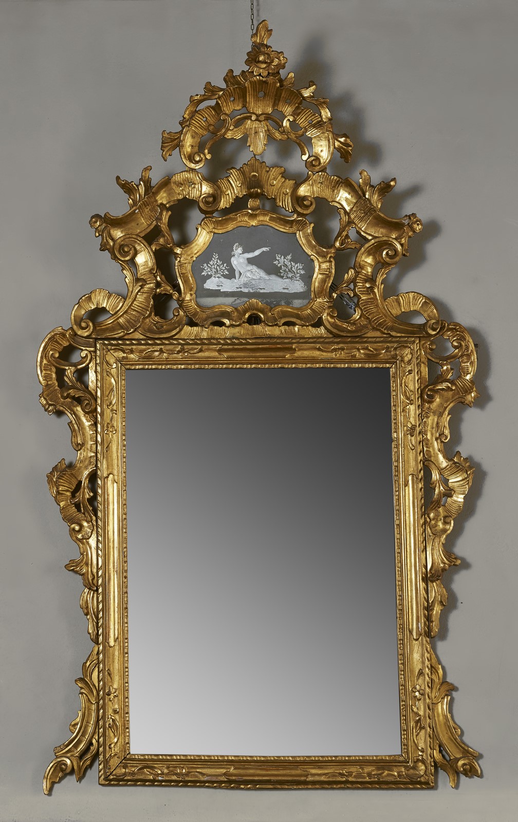 MANIFATTURA VENEZIANA Specchiera in legno dorato e intagliato. . Cm 105,00 x 175,00. con cimasa traforata centrata da specchio molato a raffigurare una figura femminile.
