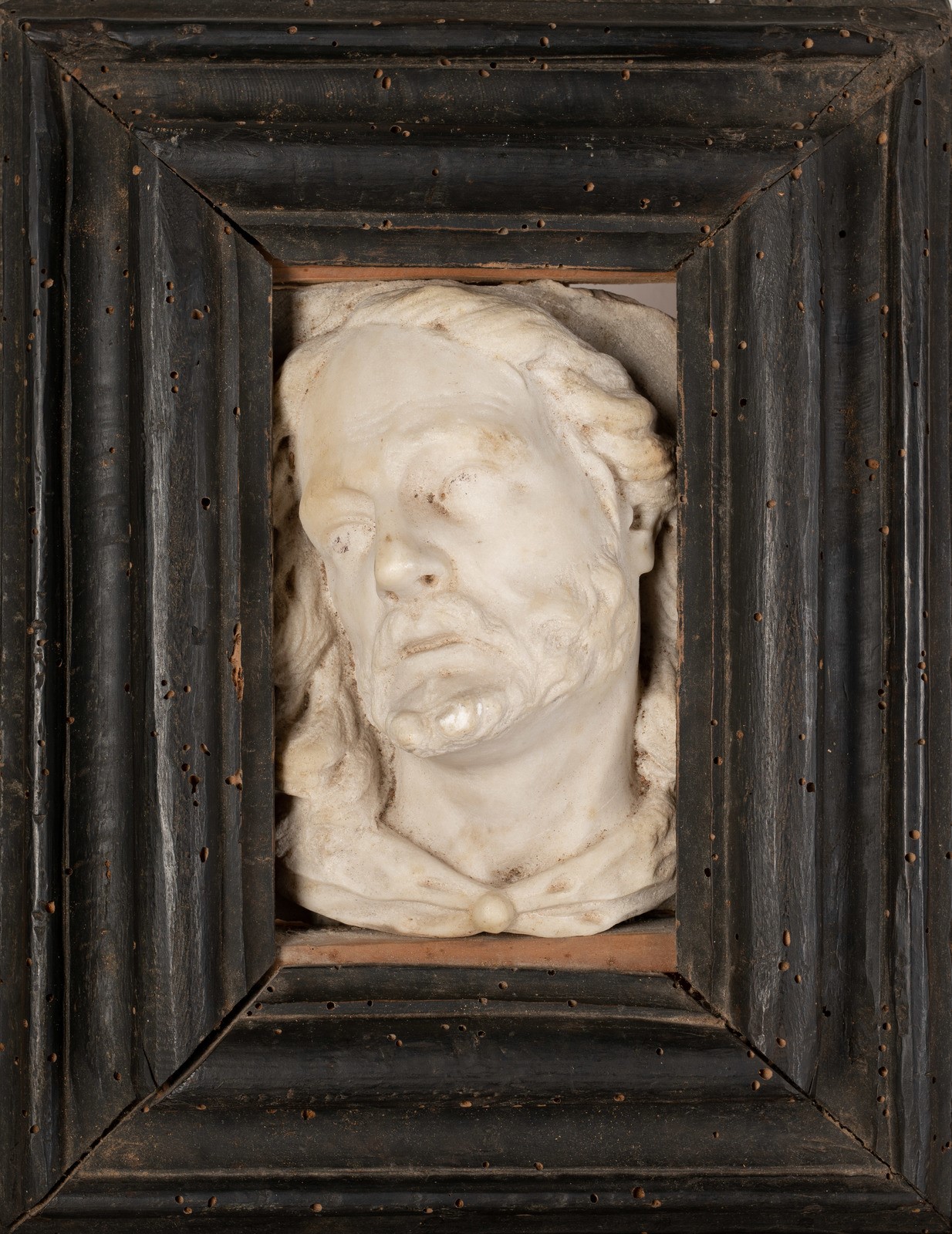 MANIFATTURA VENETA DEL XVII SECOLO Cristo in marmo scolpito. . Cm 13,00 x 18,00. Antica cornice in legno ebanizzato. . Cornice presente