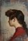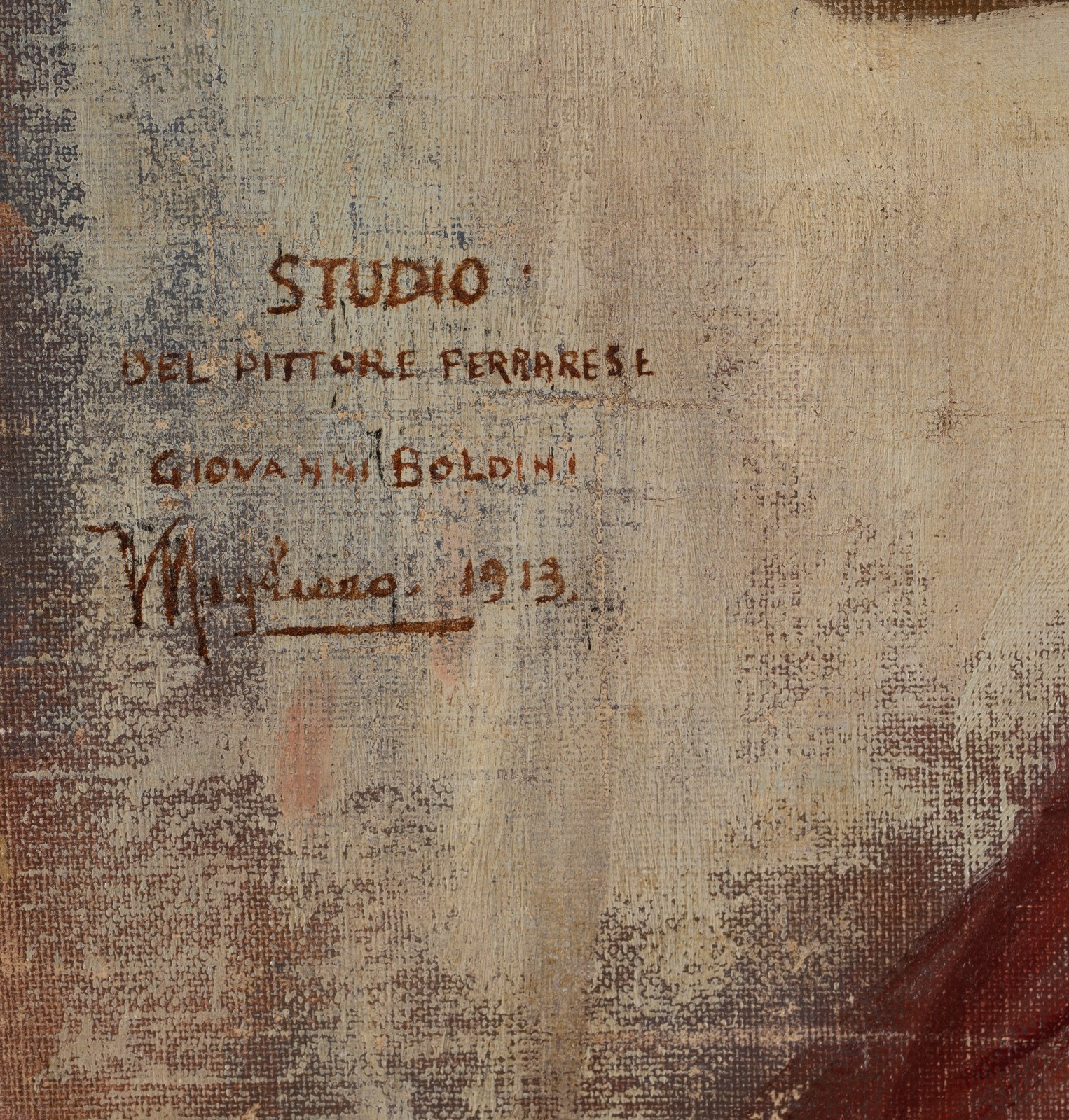 MIGLIARO VINCENZO (1858 - 1938) Ritratto di giovane donna. Omaggio a Boldini. 1913. Olio su tela applicata su masonite. Cm 25,50 x 37,50. Firmato in basso a sinistra, riporta la dicitura "Studio del pittore ferrarese Giovanni Boldini, V Migliaro, 1913".