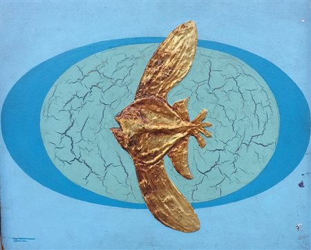 Mario Tantin (1929 - 1999) Ovale con fossile Tecnica mista e applicazione in oro su tavola cm 40x50